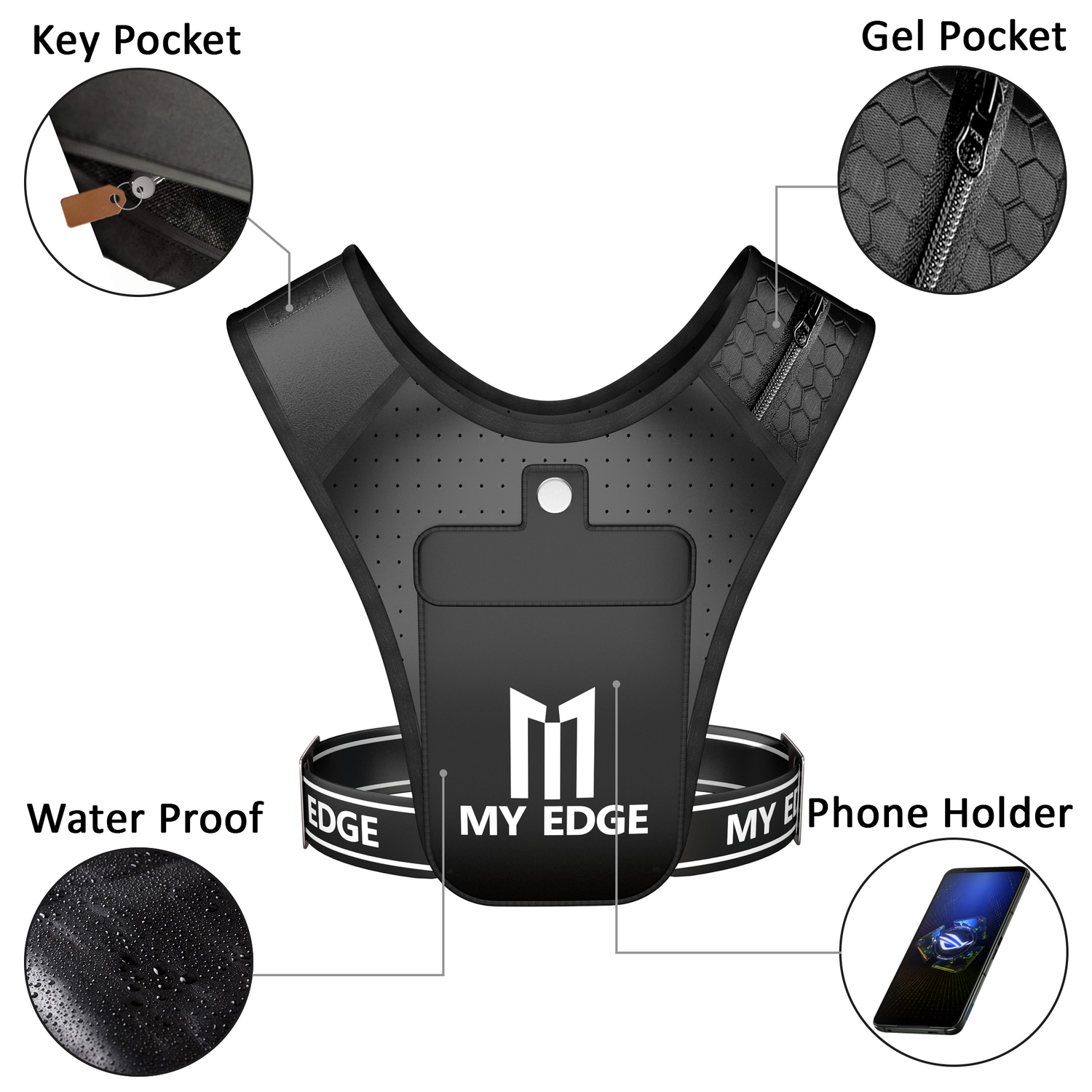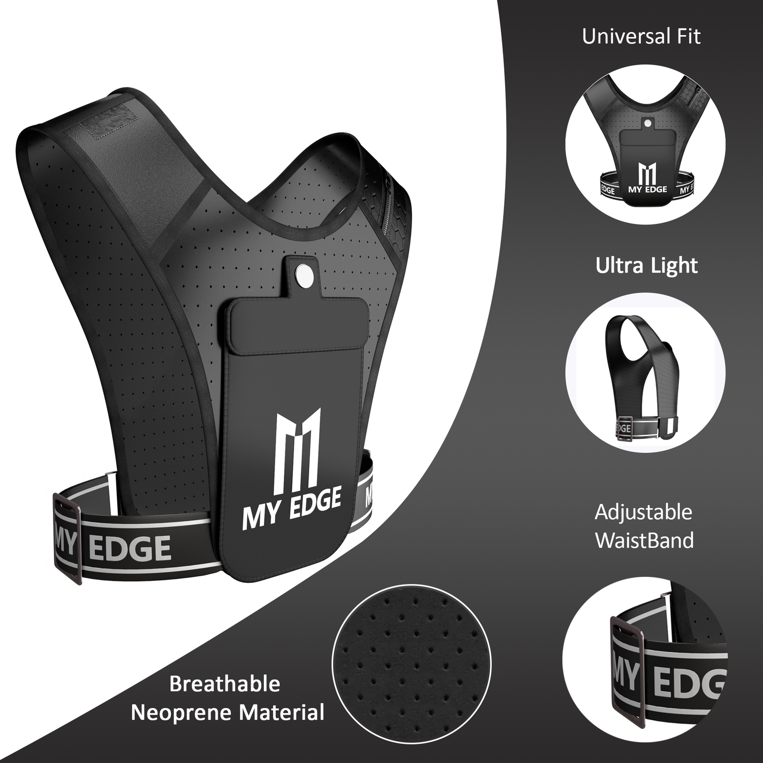 MyEdge running vests feature lightweight, breathable materials and adjustable straps for a perfect fit, plus multiple pockets and reflective elements for convenience and safety.